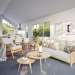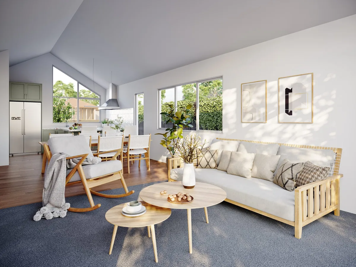 Spacious open-plan living area with a raking ceiling, filling the space with natural light