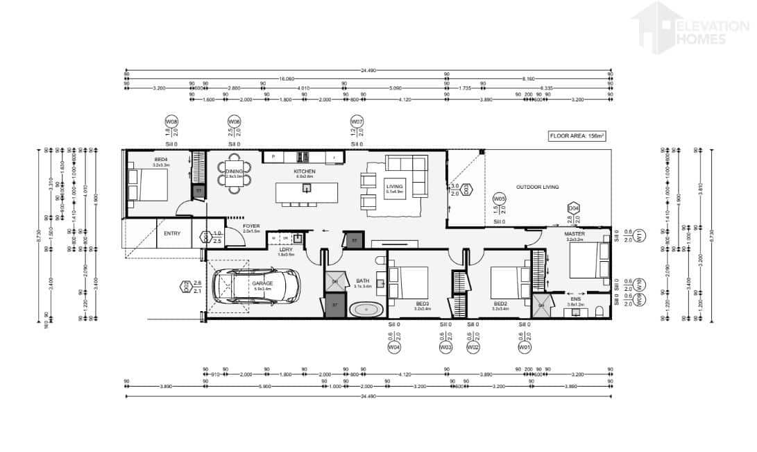 156m² floor plan with open-plan living, kitchen, and dining areas flowing to an outdoor space—perfect for entertaining or relaxing.